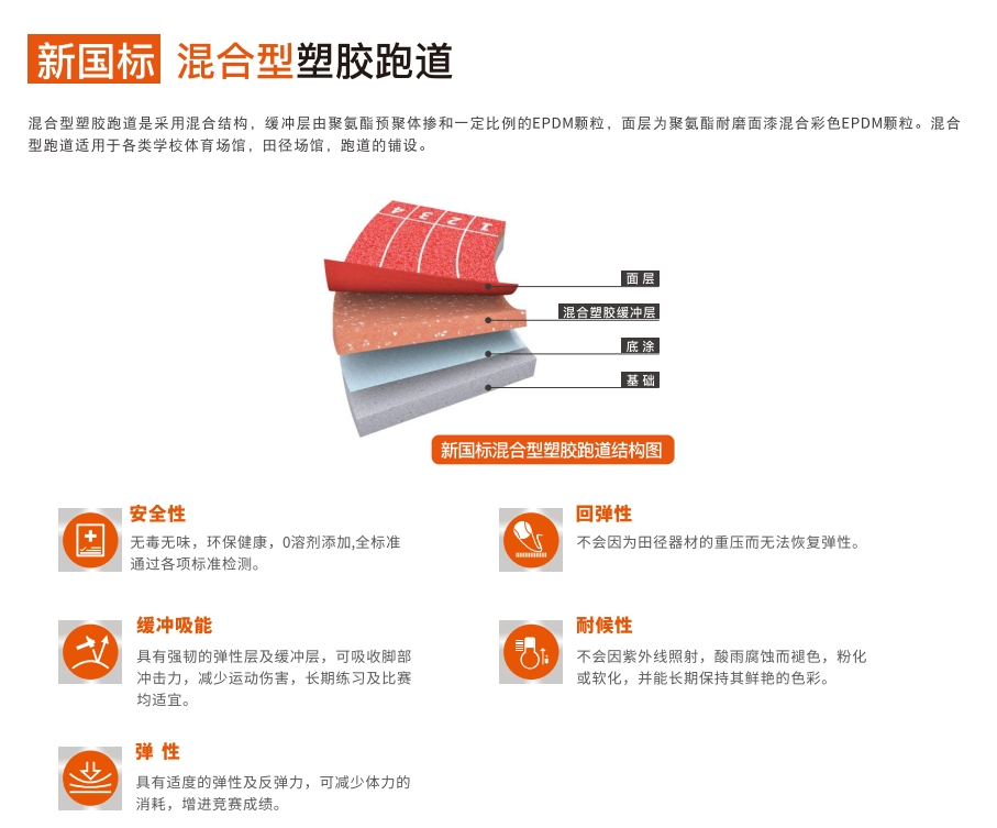 混合型塑胶跑道通过了各项标准检测,0溶剂添加,无毒无味,呵护学生在环保健康的运动场地,尽情释放运动乐趣。一所优秀学校的发展离不开学校体育的精神引领,而高品质的运动场地是开展学校体育工作的有力支撑。混合型塑胶跑道拥有强大而稳定的运动性能,能满足高频率的比赛及训练使用要求。